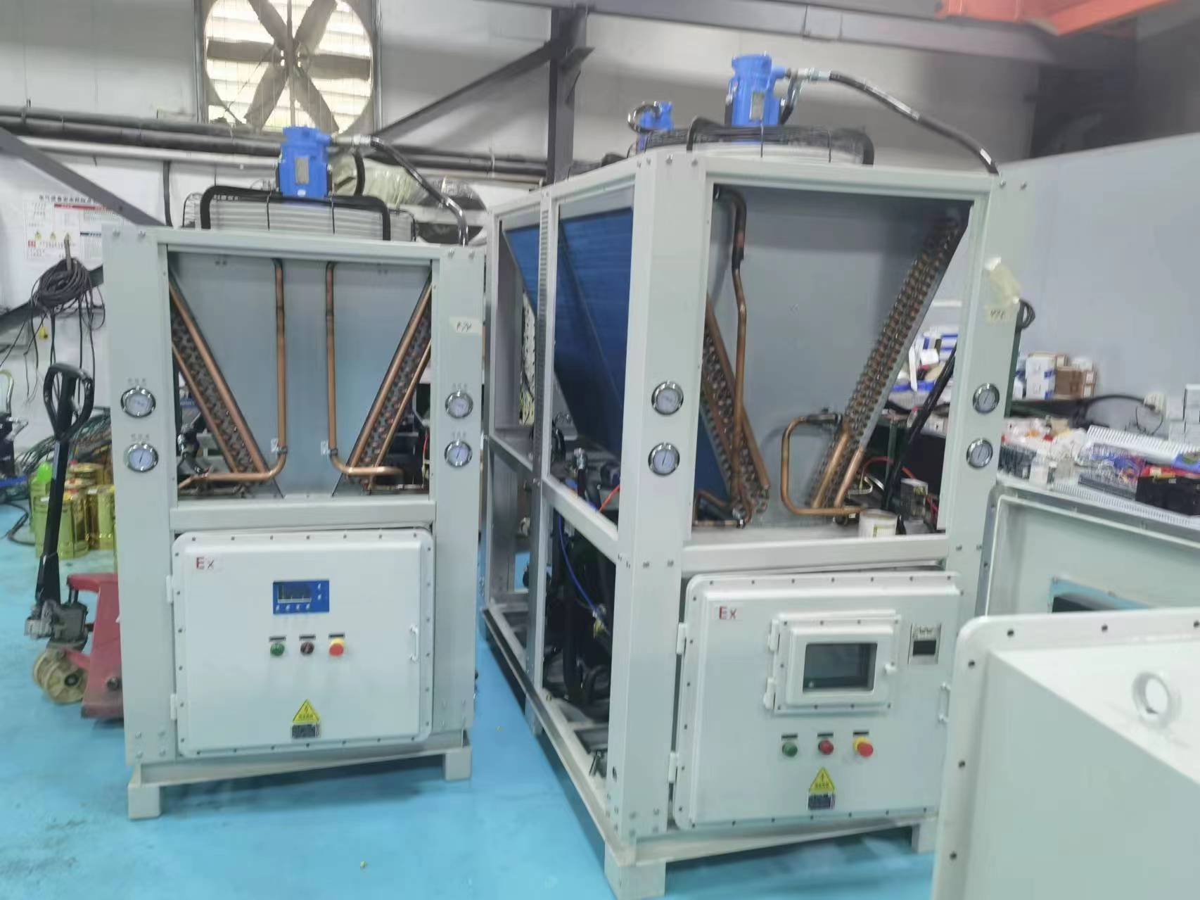 由于冷水機應用的廣泛性和多樣性,有時候經常會用于一些有易燃粉塵,氣體或者化工領域。此時冷水機為了安全的需要在電控、電機、風機等地方做防爆處理,不同場合有不同的特殊要求。故我們稱之為防爆冷水機針對。